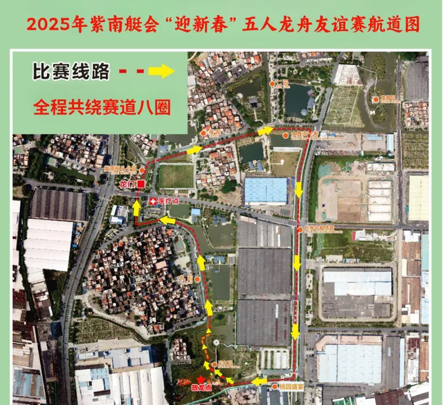 由放龍點往禮園方向出發,經吳信坤藝術館、紫南碼頭、石邱福園、水舞聲光秀舞台側水段,進入紫南路水道、桃園盛宴,回到彩虹園放龍點為一圈,繞賽道八圈,第九次經過紫南碼頭進入龍門比賽結束,全程約16.8公裏。