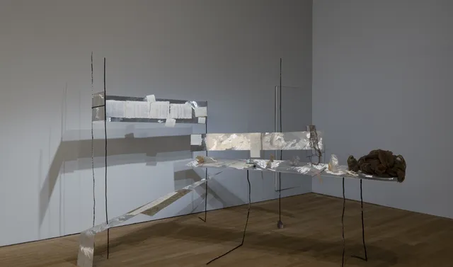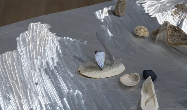 在大館展廳的角落,有一件名為【荒原上的花冠,或者,花冠上的荒原】的作品,其創作靈感來源於【神秘神學】一書中關於「鏡域」的描述。胡曉媛解釋,「現實世界好像一個鏡域,在社會系統和邏輯系統之內,這個鏡面到處都存在。它不是一個簡單的、真實的鏡子,而是時刻存在的應對關系。」作品最下面的鋼結構中,斜插的鏡面上貼了半顆薩滿石,透過鏡面呈現出完整的狀態,象征著在鏡域中借助虛象的自我完整化。基座結構之上,三根細鋼筋挑起一個復雜而搖搖欲墜的小空間,仿佛一個臨時棲居之所。其上,胡蜂巢、幹橘皮、偕老同穴被綃包裹,雖已失去生命體征,卻因綃的貼合顯出一絲生存痕跡。最頂端的棕色結構,參照的是古生物糞便化石的形狀,但其中並無實物,僅存其形。