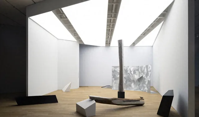 一個無人的建築空間,只剩斷壁殘垣。地上是古代象征權力的玄武巖和漢白玉,一塊廢棄木梁看似隨意地擱置其上,另一根木梁則獨自矗立在一側。