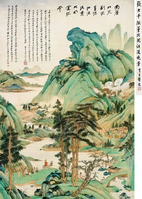 劄中提到【江隄晚景圖】及【湖山清曉圖】是大風堂藏畫中的精品。根據張氏所言,原是從徐悲鴻處借來,逾十年「始易得者」。無論大千是用其他收藏交換,或是用己畫交換、用金錢收購,總之是不容易得手的。在臺灣歷史博物館印行的【張大千作品選集】中,收有他摹畫的【江隄晚景圖】。該畫作設色精艷,筆法沈穏,深得五代、宋畫法精髓。