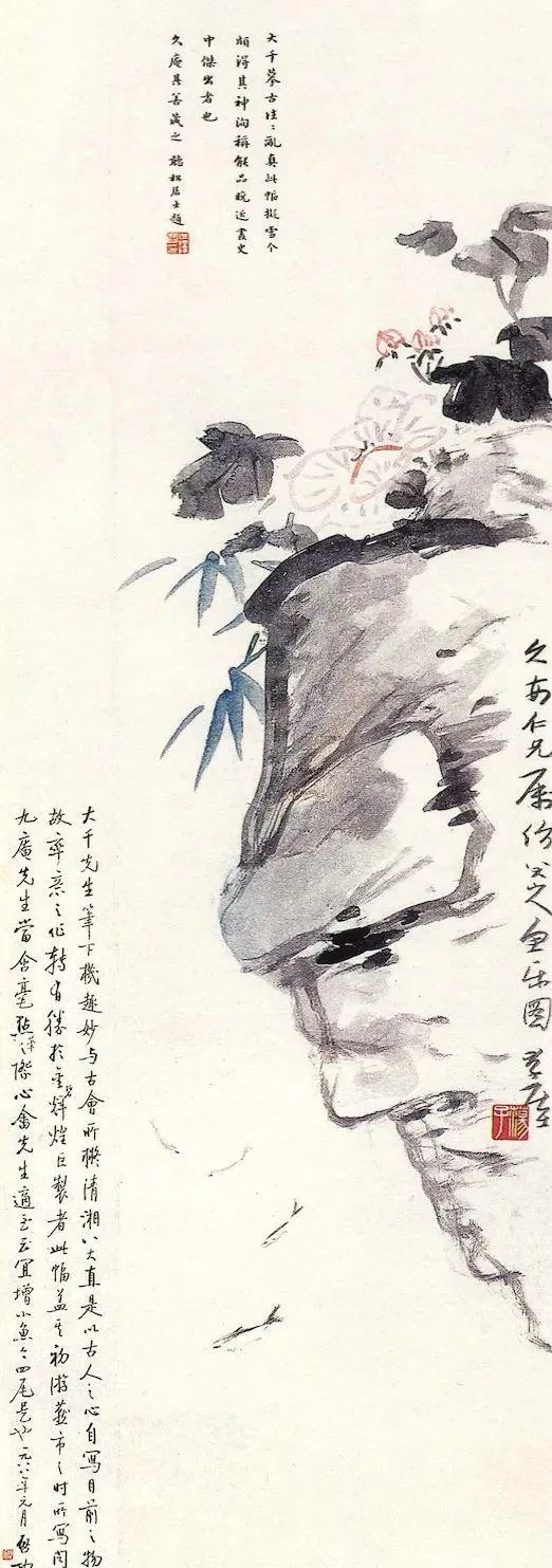 觀【仿八大山人魚樂圖】其與八大之畫確實神到肖似,尤其一行款書,淡筆墨中饒八大書法之圓渾遒逸風神。其時大千先生年三十餘歲,早已名滿京城,與溥儒先生並稱「南張北溥」。