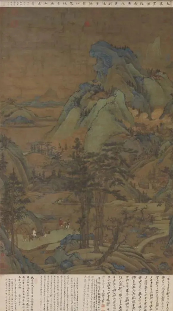 按,【大風堂名跡】第一冊中有董北苑【江隄晚景】一圖,正為溥儒簽題:「南唐董源江隄晚景圖軸」。又畫幅頂上橫額楷書:「大風堂供䍩南唐北苑副使董源畫江隄晚景無上至寶,丙戌上元西山逸士溥儒敬題。」