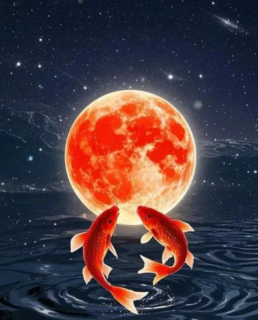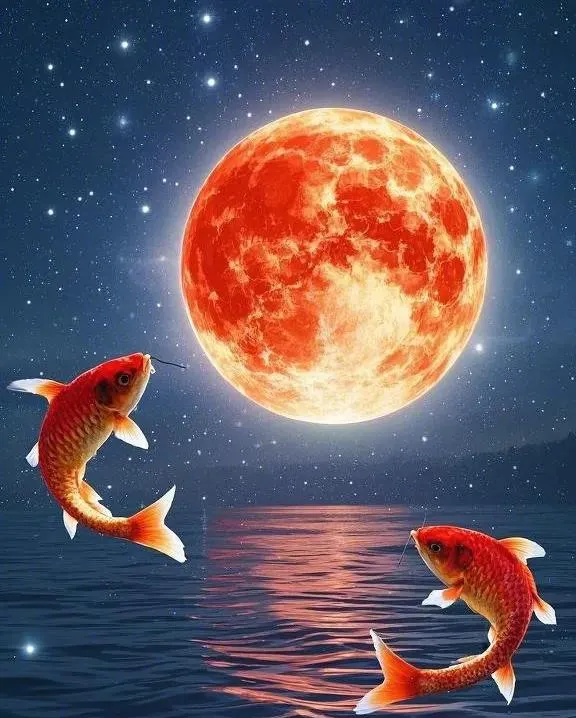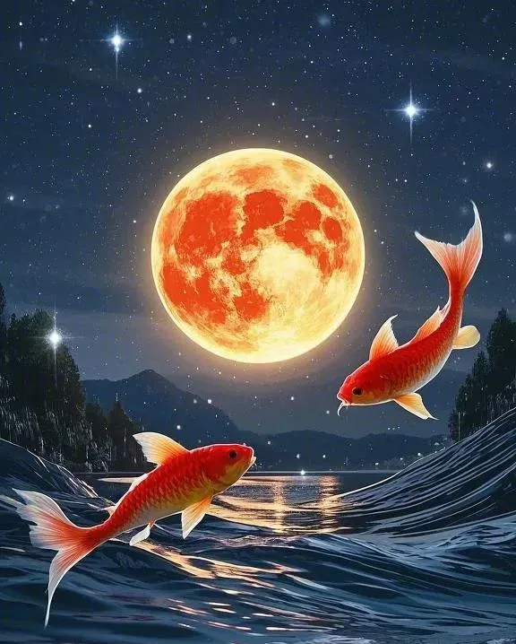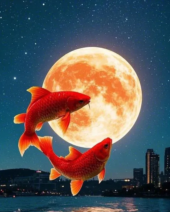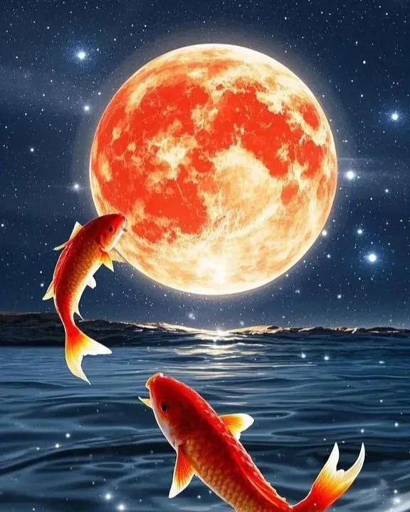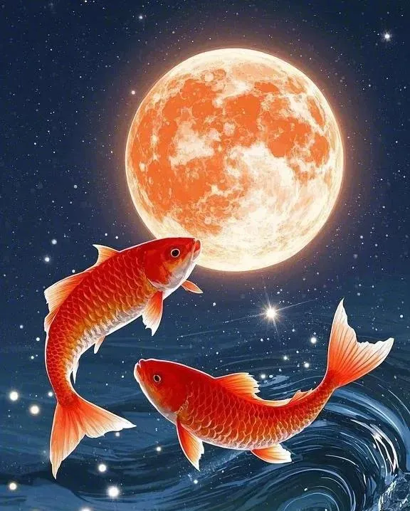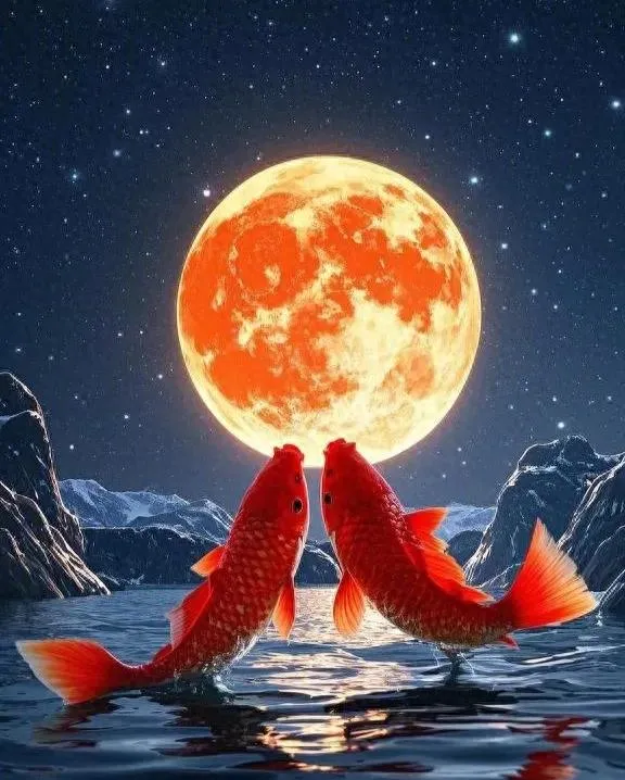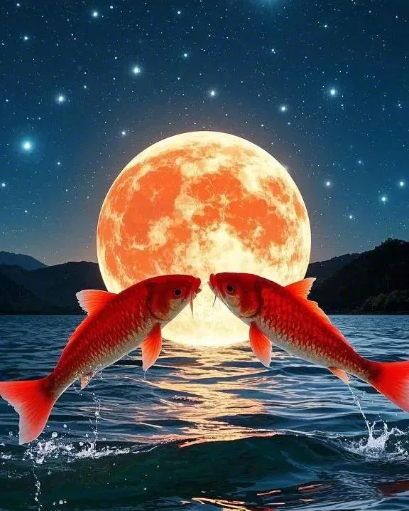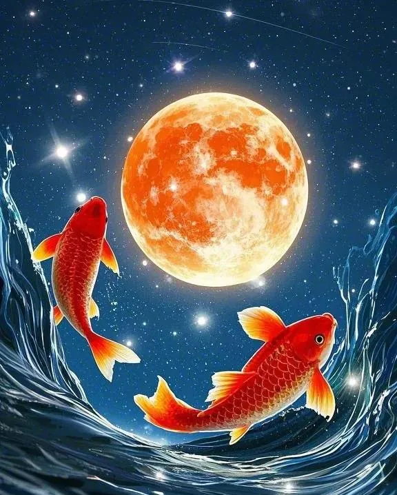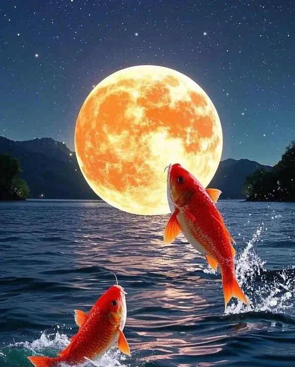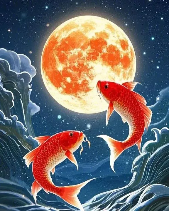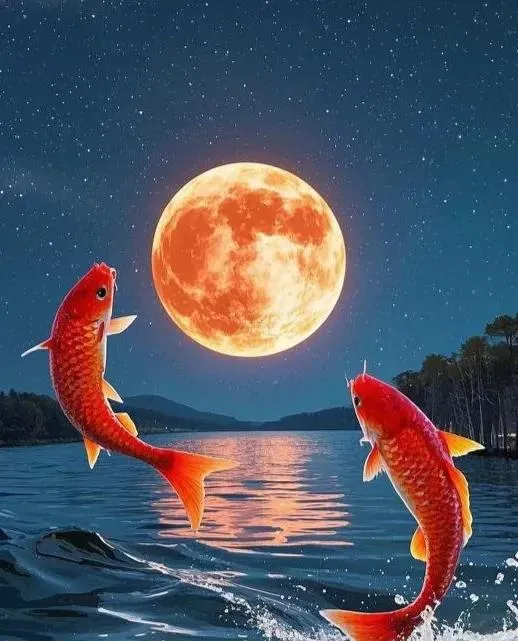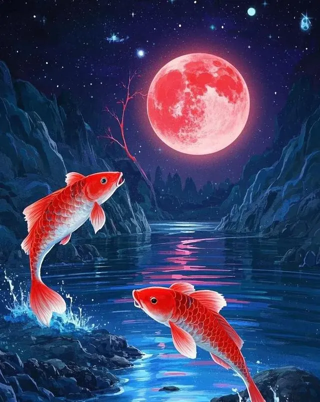 雙鯉騰躍身姿健,鱗甲翻紅耀眼中。