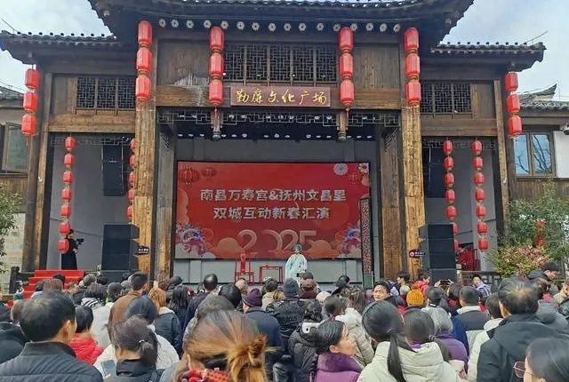 昌撫一家親,文化來互動。2月3日下午,南昌萬壽宮&撫州文昌裏雙城互動新春匯演在南昌萬壽宮歷史文化街區遊客中心戲台和撫州文昌裏歷史文化街區勤廉文化廣場舞台同時上演。舞龍舞獅、采茶戲、舞蹈、變臉、噴火等精彩節目贏得觀眾陣陣掌聲,現場氣氛熱烈。