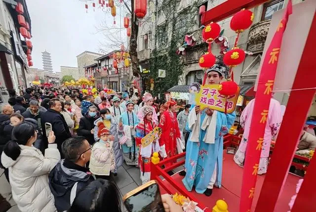 表演結束後,盛世大巡遊活動正式開啟。由南昌萬壽宮、撫州文昌裏雙城互動新春匯演演員組成的巡遊隊伍,上演傳統與現代共融的視覺盛宴,帶領遊客穿越入戲,沈浸式體驗文昌裏風情,遊人好評如潮。