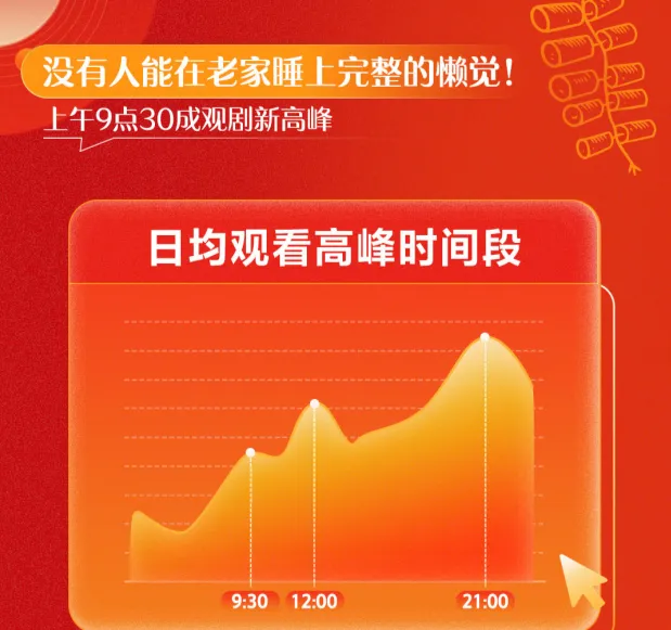 春節期間,熬夜的人少了,早起的多了。觀看時段方面,移動端觀看峰值出現在21點,大屏端觀看峰值出現在19點。在大屏端,上午9點30分成又一觀看新高峰,這也與社交媒體上的網友動態形成呼應,不少人笑稱:「沒有人能在老家睡上完整的懶覺!」此外,下午14點至16點期間也較平日有所增多,折射出假期作息調整帶來的"錯峰觀影"現象。