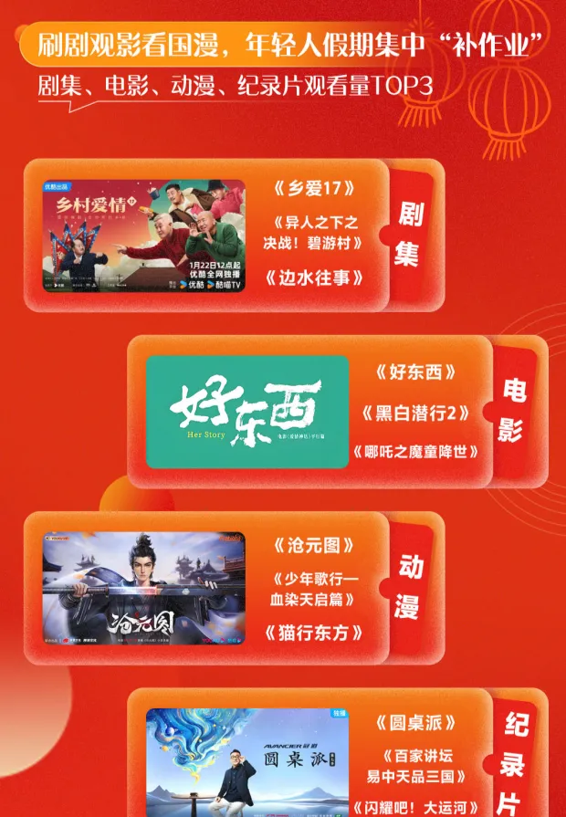 內容消費上呈現"新老交融"態勢,綜藝晚會、劇集、電影依然最受觀眾喜愛。劇影方面, 「精神年貨」【鄉村愛情17】延續國民IP號召力獲觀看量最高,熱播劇【異人之下之決戰!碧遊村】【邊水往事】【清明上河圖密碼】觀看量名列前茅。經典劇集【甄嬛傳】【知否知否應是綠肥紅瘦】【西遊記】持續發揮"電子年夜飯"功能,成為闔家歡必看電視劇。受賀歲檔影片帶動,【哪咤之魔童降世】【封神第一部:朝歌風雲】「唐人街探案系列」進入優酷電影頻道觀看top5。