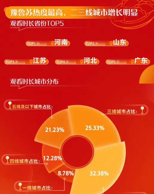 觀看地域分布上,家族文化濃厚省份從平台觀看量可窺知一二,河南、山東、江蘇、河北、廣東五省排名前五。此外,受春節返鄉等多重因素影響,二三線城市觀看時長提升明顯,五線城市大屏端觀看占比最高,達23.66%,一線城市僅占5.8%。