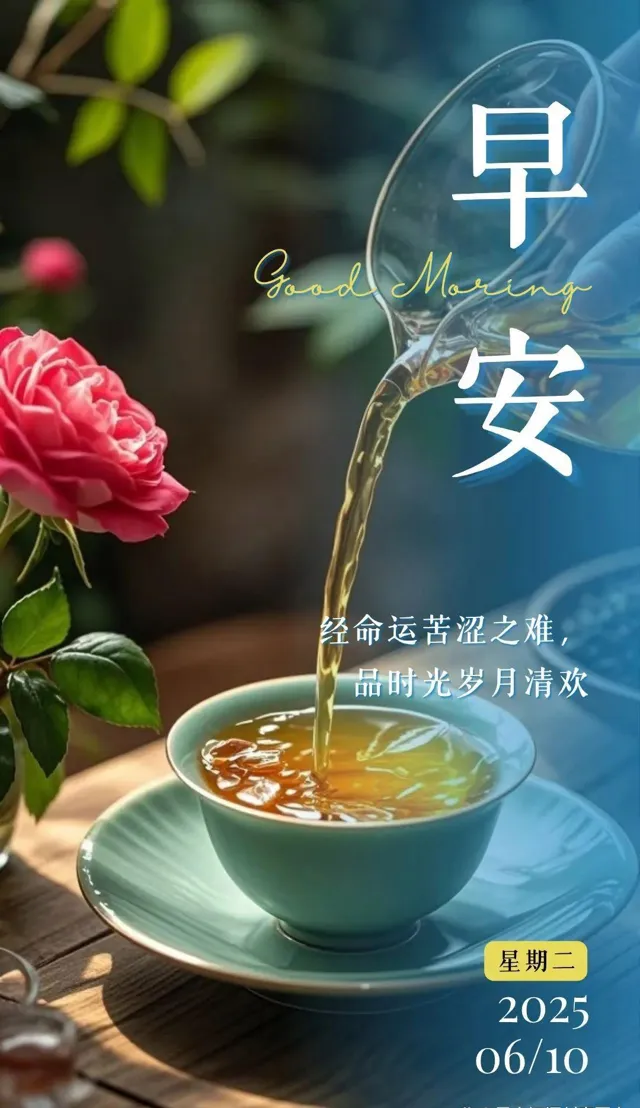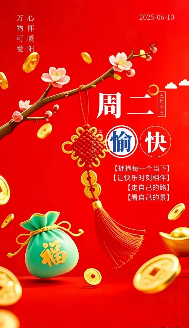 10、周二的清晨,空氣裏都是清新的味道,連風都帶著點甜。這樣的時刻,最適合給生活充能了——願你像充滿電的手機,帶著滿滿的動力出門;像剛出爐的麵包,帶著熱乎的溫度擁抱世界。今天可能會有挑戰:或許是難搞的工作任務,或許是復雜的人際關系,或許是突如其來的變故。但請記得,每一次你選擇面對而不是逃避,都是在給「成長」打勾;每一次你咬著牙堅持而不是放棄,都是在給「強大」加分。這些嘗試或許不會立刻開花結果,但它們會在你心裏種下種子;這些努力或許看起來微不足道,但它們會在時光裏匯整合河。所以啊,別害怕,別退縮,就帶著這份能量與熱情,去闖、去試、去拼。周二快樂,你比自己想象的更強大,而這份強大,正在今天的你身上,慢慢發光!