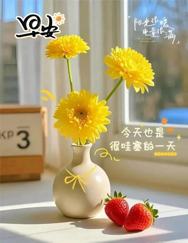 2、晨風裹著草木的清潤掠過發梢,陽光像被揉碎的金箔,輕輕鋪在桌面。這是周二獨有的溫柔開場白——不必急著追趕昨日的影子,不妨停一停,用手掌輕觸自己的肩膀,像安撫一位並肩作戰的老友:「你看,我們又站在了新的起點。」那些細碎的進步,哪怕只是早起時多賴的五分鐘,或是認真泡的一杯茶,都在時光裏閃著光;每一份咬牙堅持的日子,都在悄悄編織未來的錦緞。周二快樂呀,願這一天從「元氣」開始,到「滿足」收尾。