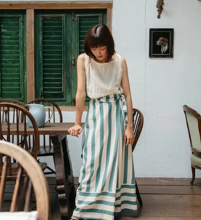條紋長裙與碎花長裙在近幾年十分流行,在搭配時建議上半身以素色為主,鞋子選擇球鞋、素面涼鞋,才不會讓整體穿搭顯得太過花俏雜亂,失去視覺焦點。上衣如果可以和長裙顏色互相呼應,例如上圖的綠白條紋裙,配上白背心,看起來會更時尚有型喔!