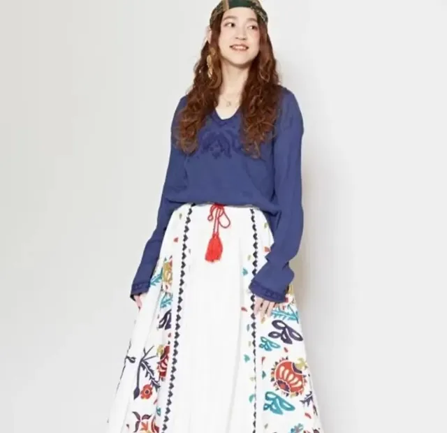 在夏天會常常去海邊或是外出度假,穿上色彩豐富的民俗風長裙,戴上編織草帽,就像是昭告大家「我要去度假了!」,奇幻森林蘇劄尼刺繡長裙飾有大膽的康乃馨和石榴刺繡。設計靈感來自蘇劄尼刺繡,據說起源於烏茲別克。腰頭的流蘇令人印象深刻。光滑的棉質材質具有出色的透氣性,方便日常著用。