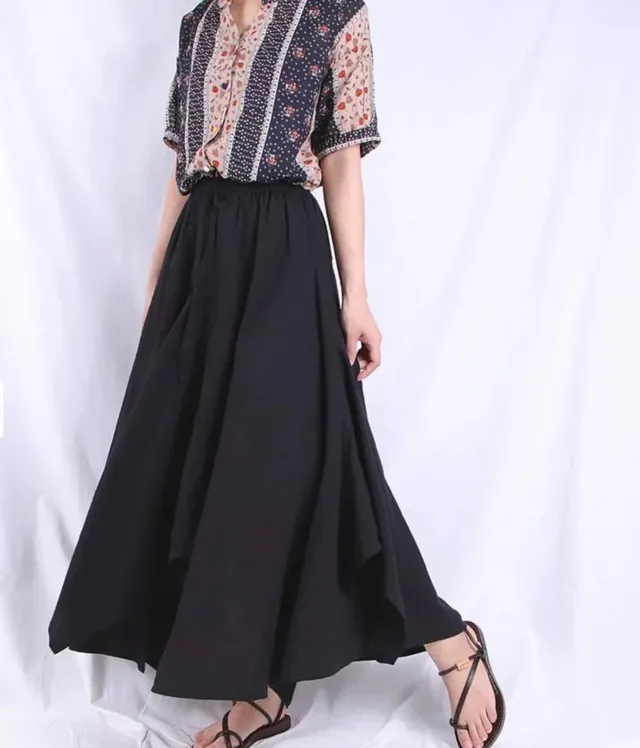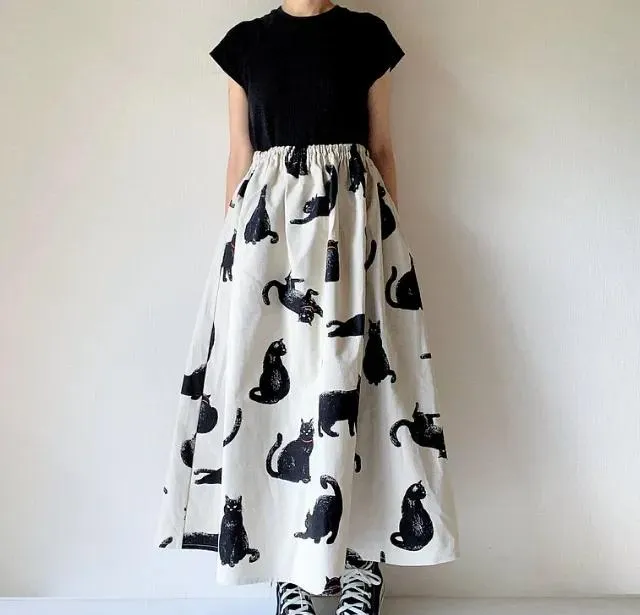 日本手工制造的黑貓棉麻長裙,是貓咪愛好者必收的單品,布料材質較硬挺,無內裡但不會透光夏天穿出門涼爽舒適,一年四季都能搭配。因為長裙是白色底配黑貓,上衣和鞋子搭配黑色或白色都十分合適,也建議以素色上衣為主,讓全身重點放在黑貓長裙上。