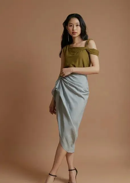 如果是下班後有飯局,一件素色窄裙搭配素色或花色上衣,就能打造稍微正式,又有造型的穿搭,花苞窄裙特殊的抓皺設計,隨著走動會呈現不同的皺褶效果,前擺開衩讓你走路時可小露性感,卻又能遮住臀腿較寬大的地方。