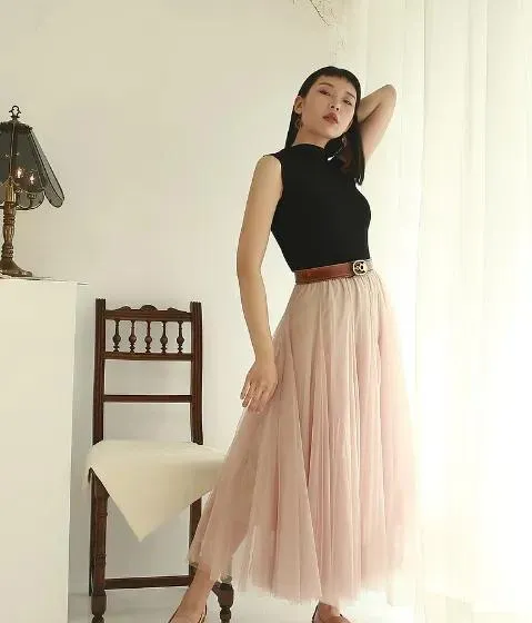長紗裙是最容易穿出仙氣的長裙種類,若隱若現的裙擺,搭配夢幻的豆沙粉色,適合穿去正式餐會或是婚禮,這款收腰份量感長紗裙,還附上高密度鬆緊腰帶,綁在腰上讓你的腿部比例再拉長。