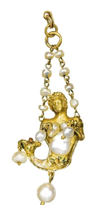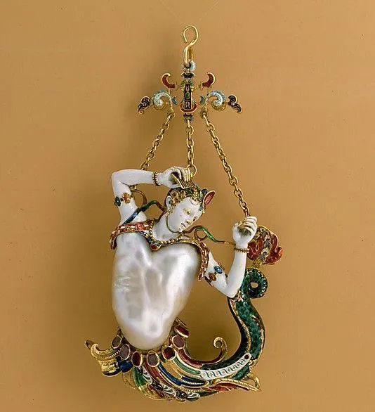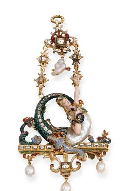 說到巴洛克珍珠,就不得不先提一下這枚在珠寶和藝術史上最具代表性的古董吊墜——「The Canning Jewel」。這是一件16世紀後期的義大利項墜,現收藏於倫敦維多利亞和阿伯特博物館裏。吊墜表現的是一條人魚,碩大的巴洛克珍珠完美無缺地表現了人魚的軀幹;人魚的頭部是用黃金制成,白色琺瑯塗在臉部,絡腮胡子和頭發是裸露的黃金;人魚的胳膊也塗上了白色的琺瑯;人魚的尾巴主要采用綠色和黃色琺瑯,正面鑲嵌有一顆巨大的雕刻紅寶石,以及其他寶石。人魚的左手舉一塊透雕細工制成、用琺瑯和寶石修飾的盾牌;右手握一把土耳其短彎刀。