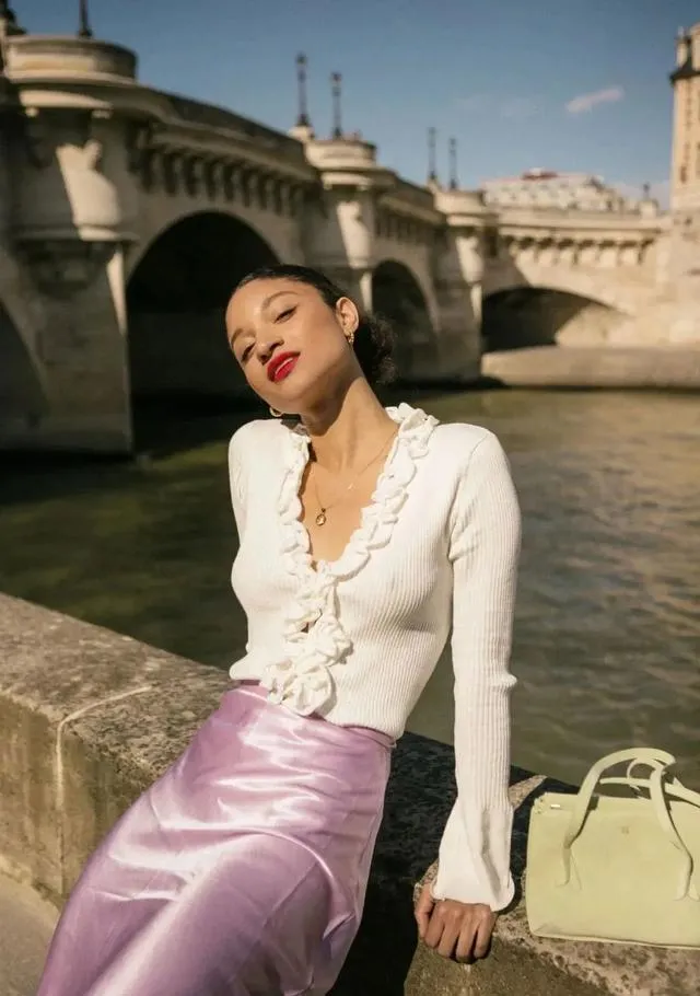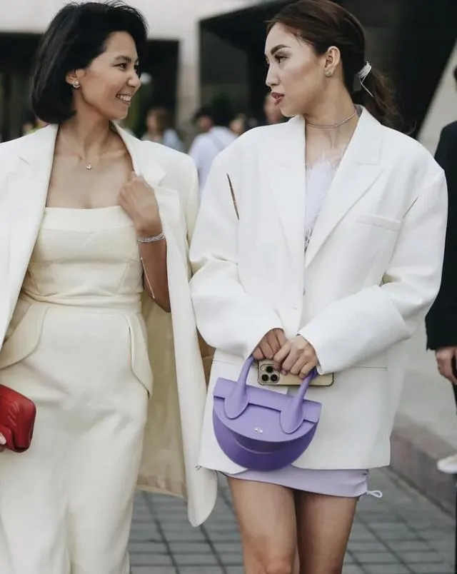 比如:身著白衣,手提一款別具一格的紫色包包,既不失白色的清新脫俗,又透過紫色的巧妙運用,為整體造型增添了一抹令人眼前一亮的亮色。