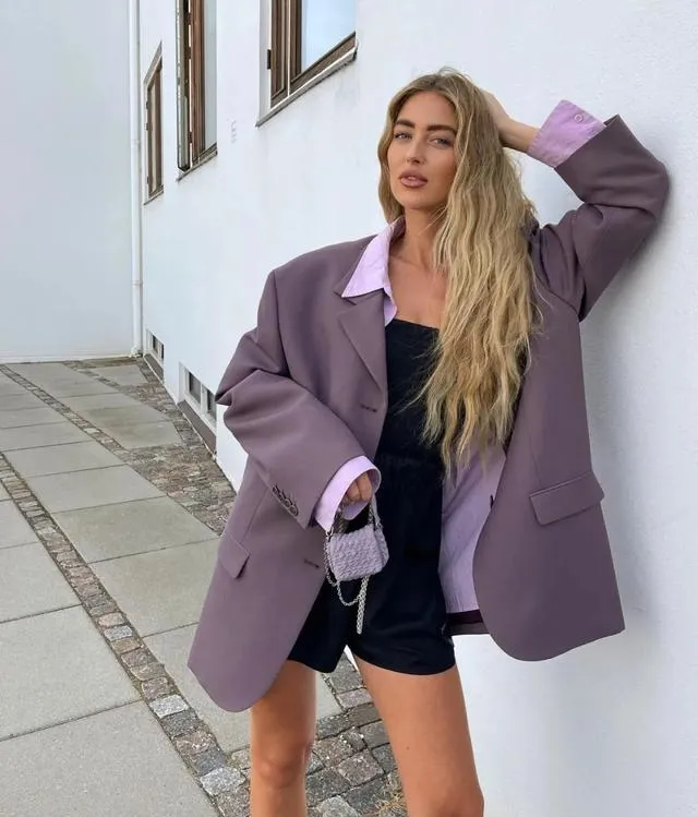 膚色白的姐妹大膽把紫色往前移,下裝搭配一條黑色長褲,優雅高級不言而喻。
