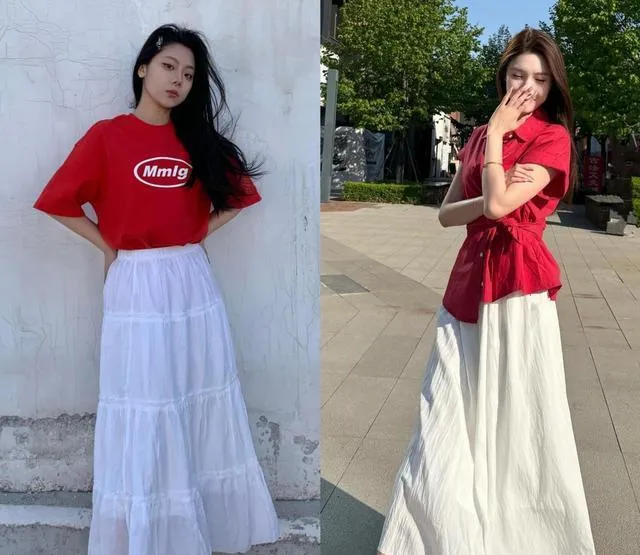 白色的半身裙本來就透著一股清新氣息,再加上小紅鞋那麽一踩,簡直就是給俏皮和驚艷添了火!毫不做作,還透著點法式復古的優雅呢!
