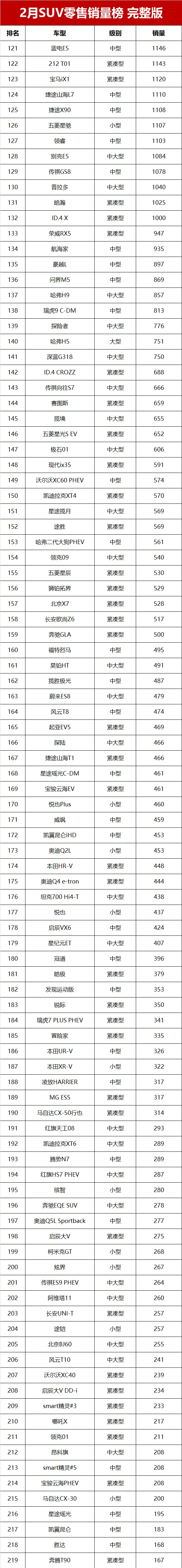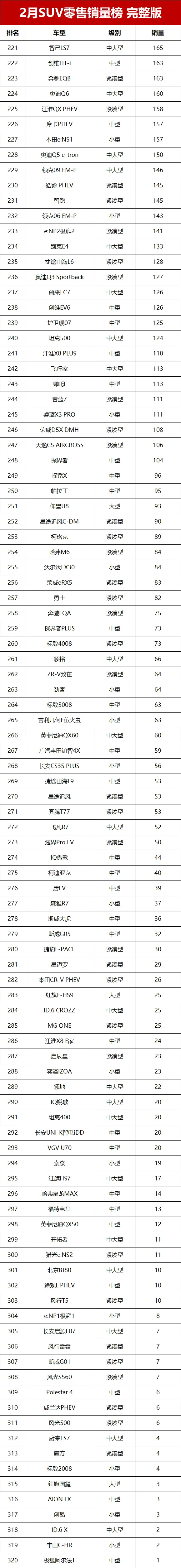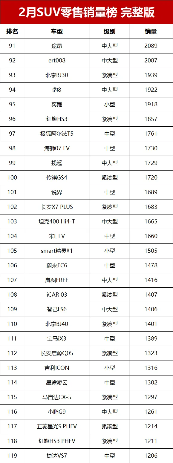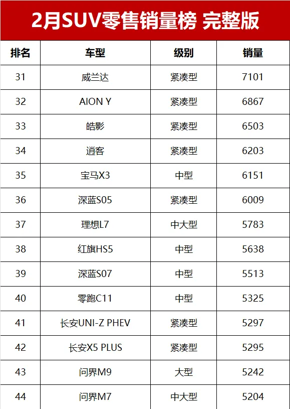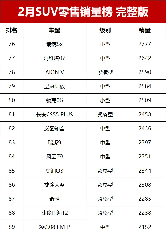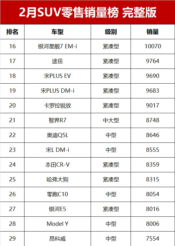 曾經的合資SUV銷量之王本田CR-V,2月零售交流8359輛,排名第24位元。來自長城汽車的哈弗大狗和哈弗H6銷量分別為8315輛和7515輛,排名第25和第30位。