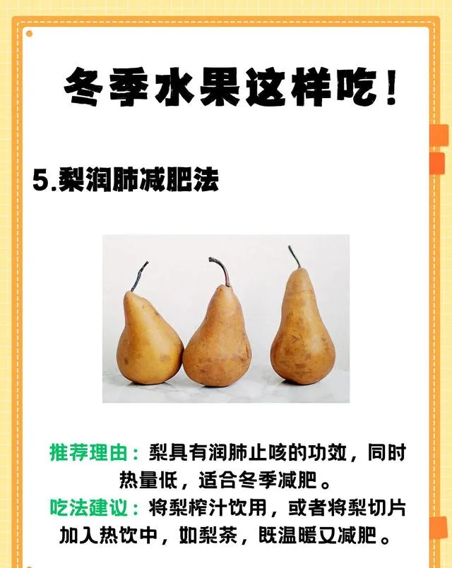 -推薦理由:梨具有潤肺止咳的功效,同時熱量低,適合冬季減肥。