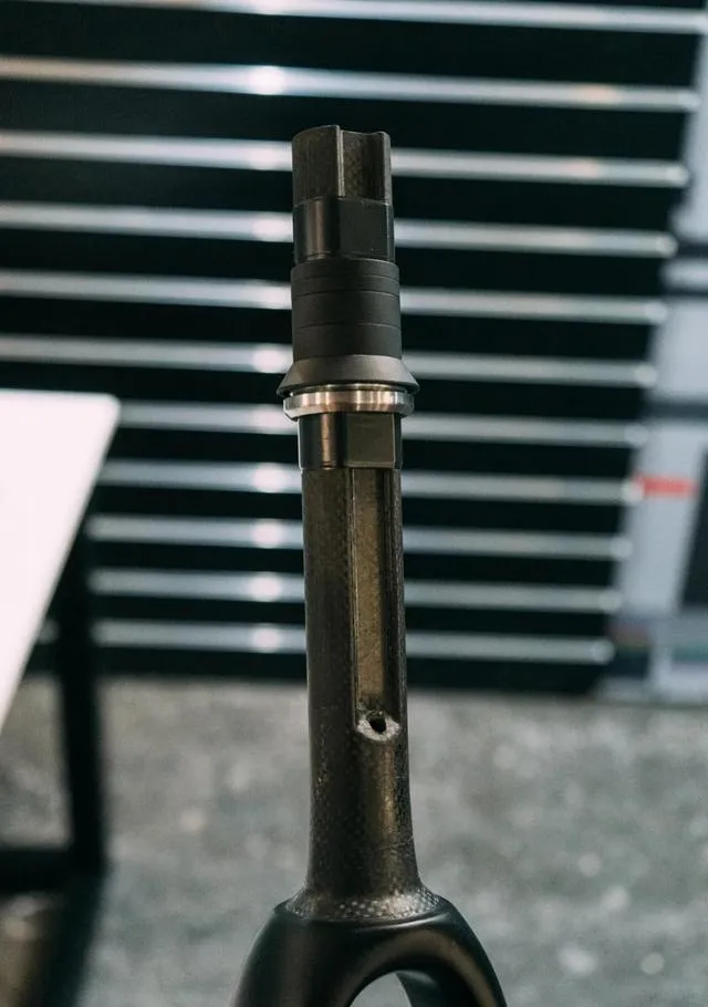 為了更緊湊的頭管空間,前叉還配有上碗軸承,上碗蓋,以及一系列的墊圈組合。目前並不清楚車架上多余的孔位該如何封堵,但這個前叉的效果好到當我路過該品牌展車時,我以為這「只是」一台擁有花哨塗裝的SL8。但實際上是一台全內走的SL6。