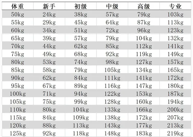 - 入門水平:可以熟練推起大於體重的杠鈴,開始在力量上追求突破。