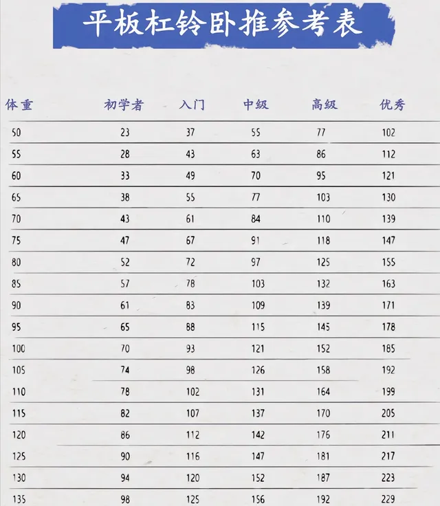 不少人為了體面,拼命加重量,搞得肌肉拉傷。這張平板臥推參考表會讓你明白:合格的重量標準因體重而異,臥推重量根本沒必要攀比,看完數據表,或許你會重新定義合格與優秀的意義。