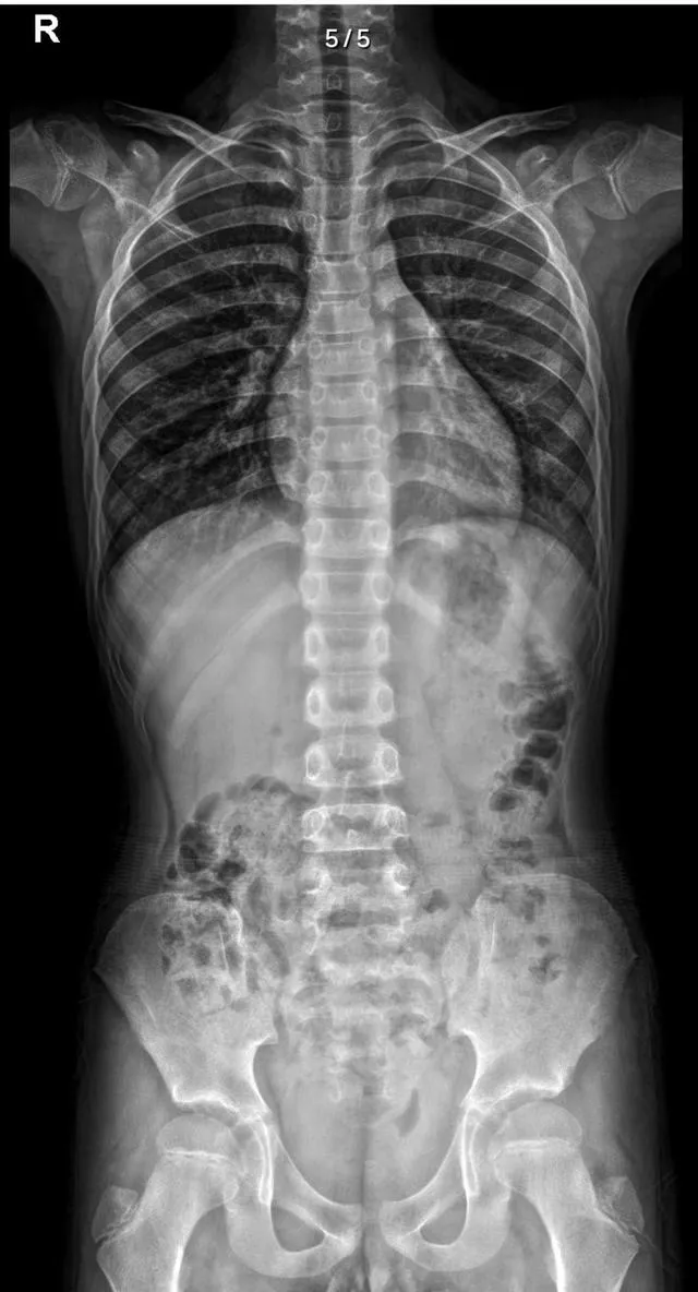 2、影像檢查: 脊柱整體向右側偏移,兩側髂骨左高右低,兩側股骨左高右低。