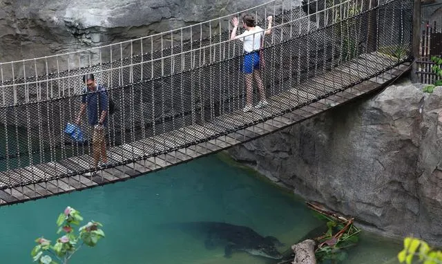 3月12日,在新加坡萬態野生動物世界的亞洲雨林探險園,遊客站在吊橋上。新華社/歐新
