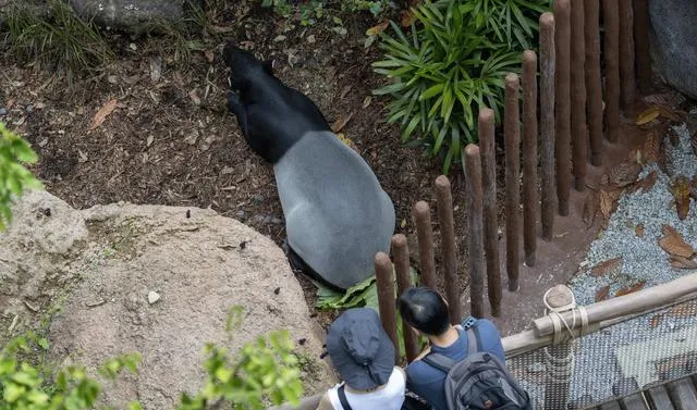 3月12日,在新加坡亞洲雨林探險園,遊客在觀看一只馬來獏。新華社/歐新