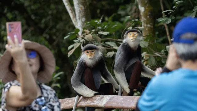 3月12日,在新加坡亞洲雨林探險園,遊客拍攝白臀葉猴。新華社/歐新