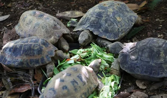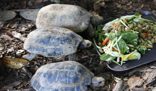 3月12日,在新加坡亞洲雨林探險園,亞洲巨龜和緬甸陸龜正在進食。新華社/歐新