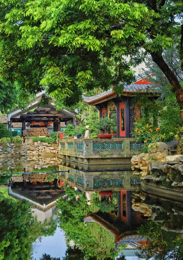 往前走便是汀芷園, 簡直是靜謐中的詩意棲居,嶺南建築古風在這裏體現的淋漓盡致。 假山、亭台、樓閣、花木,湖水清澈見底,倒映著藍天綠樹與嶺南古建築。
