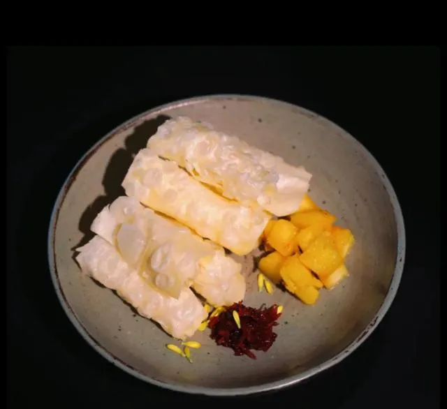 輕輕夾一塊乳扇,取少量玫瑰醬和鳳梨丁放在上面, 乳扇的脆、玫瑰醬的花香和甜香、鳳梨丁的酸甜融合得恰如其分, 甚至還能吃到玫瑰醬裏細碎的花瓣,輕嚼幾口就滿口留香。