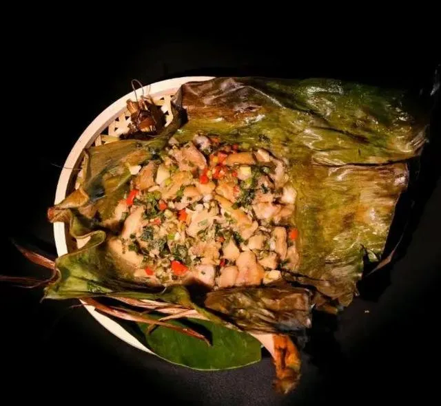 主理人表示, 這道包燒雞腳筋采用傳統雲南土菜「包燒」的做法。 將天然的芭蕉綠葉作為鍋具,把烹飪的食材包裹後,以炭火為熱源,讓食物慢慢燒熟。這樣烤出來的菜肴,內建濃濃的芭蕉清香和炭火味, 佐以傣族特色調味,蔥、姜、蒜、檸檬、小米辣、薄荷,再外加幾種復合香料,延續了牛肉的雲南風情, 卻又在口感上提供了另一重體驗。