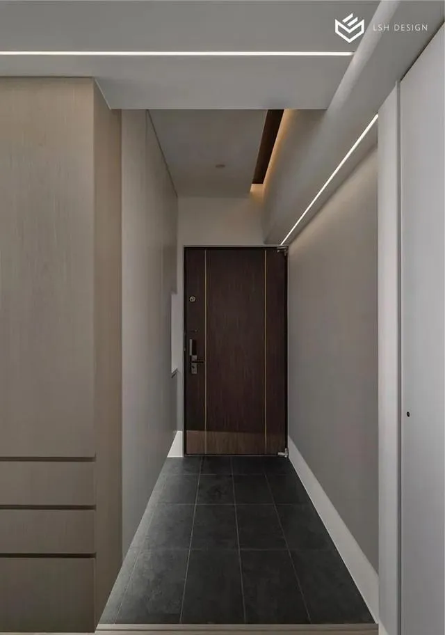 長型玄關鋪上深色磁磚,界定出落塵區