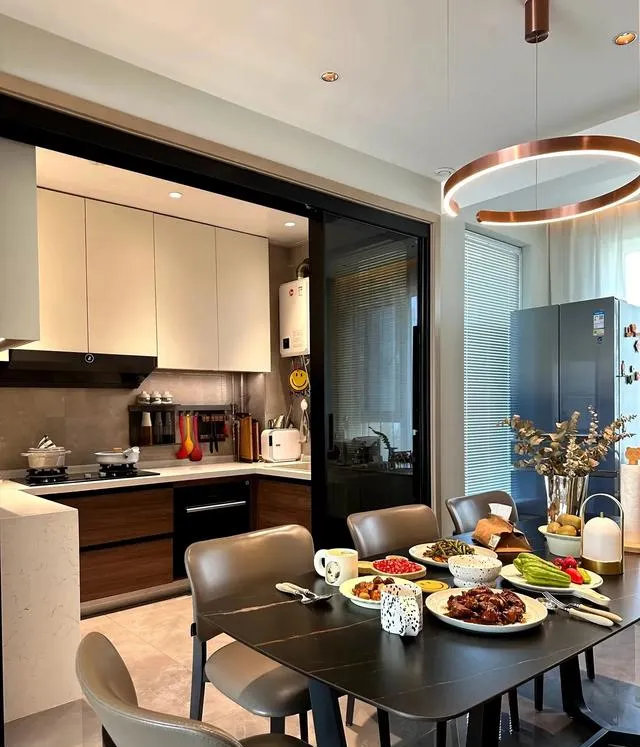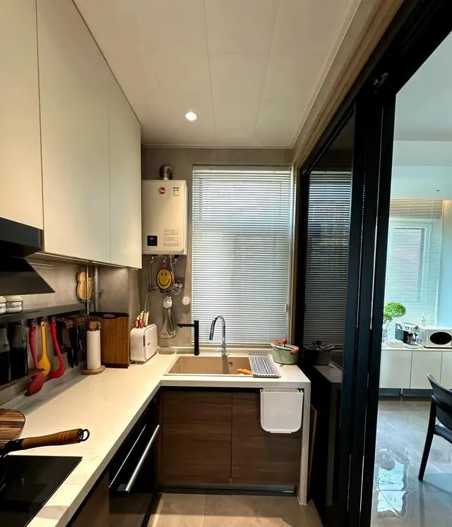 廚房區域整體設計很好,櫥櫃U型布局,櫃門木色 ➕ 暖白色,平板門,不做明拉手。水槽做大單槽。