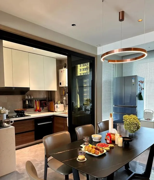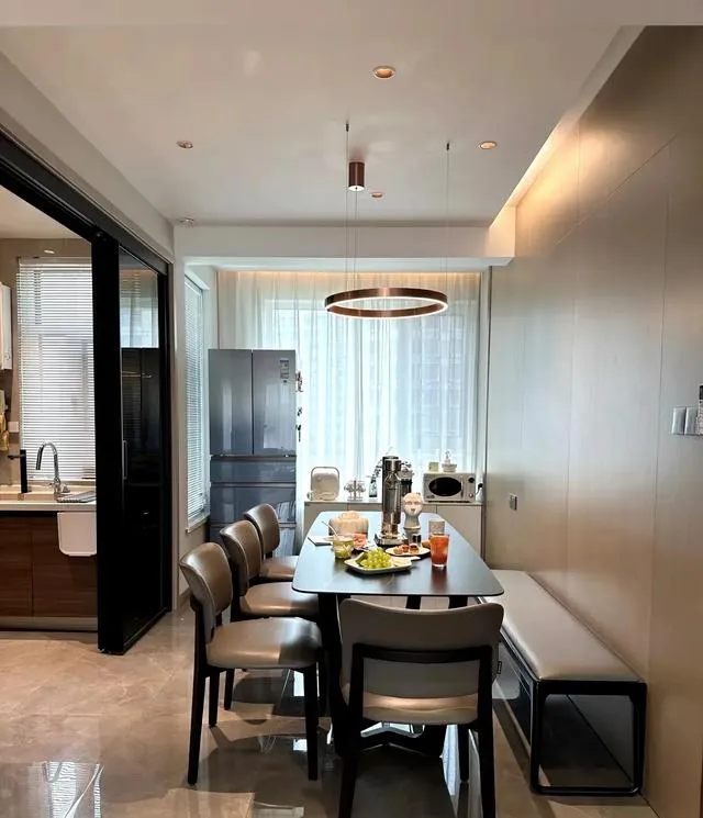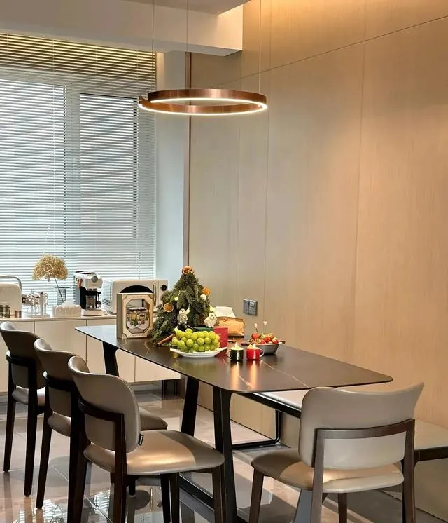 餐廳區域選擇深色巖板餐桌,尺寸為800/1600. 質感不錯。上方搭配吊燈,餐廳區域背景墻木飾面做造型。