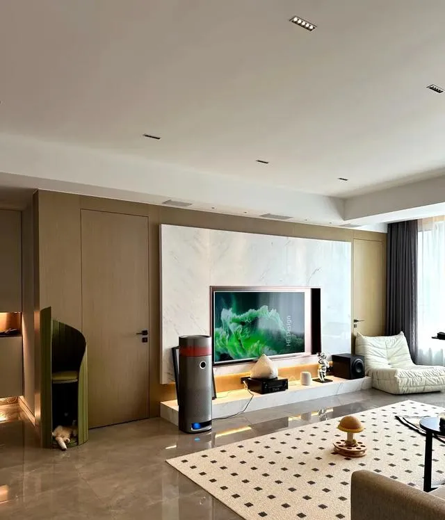 客廳區域電視背景墻造型簡潔大氣,巖板 ➕ 木飾面,電視內嵌進去,旁邊是隱形門,整體很大氣上檔次。