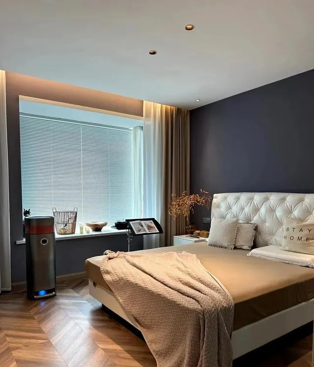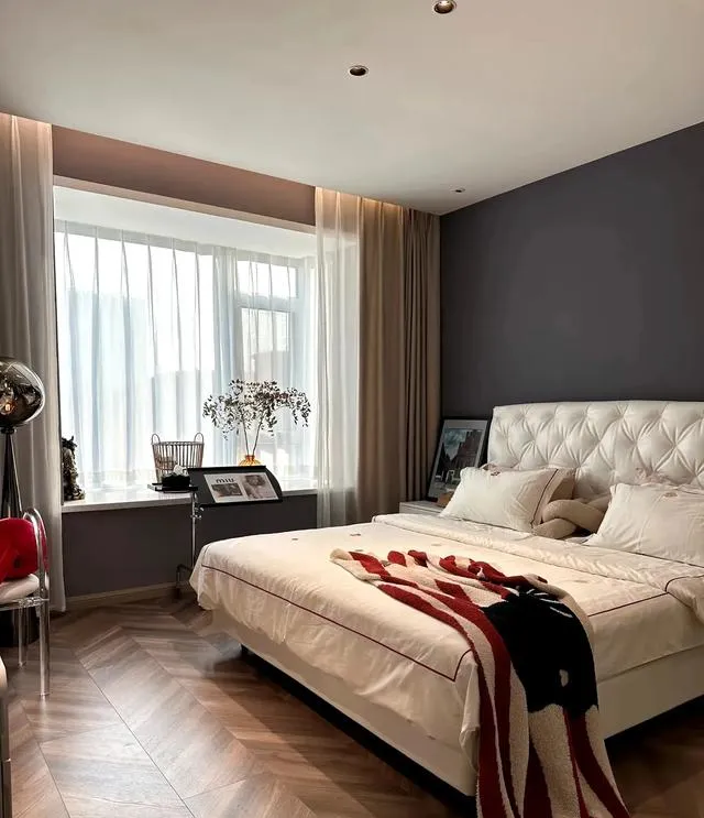 臥室區域地面通鋪暖色人字拼木地板,床頭背景墻鋪貼深灰色墻布,整體效果不錯。窗簾選擇純色窗簾。