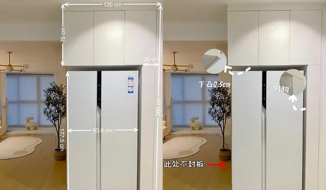 溫馨提示: 要麽幹脆不做嵌入式設計,要麽就選擇那種半封閉式的設計,對冰箱的尺寸沒有那麽苛刻,也更方便冰箱散熱和使用。