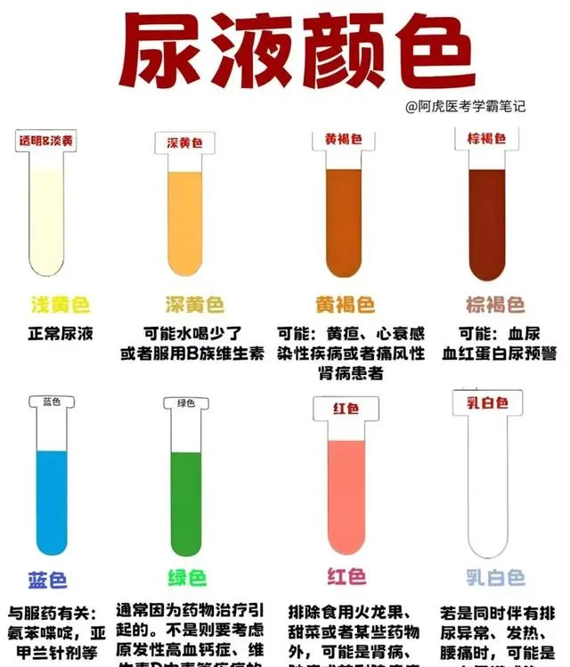乳白色:乳糜尿(淋巴管堵塞)或尿路感染。