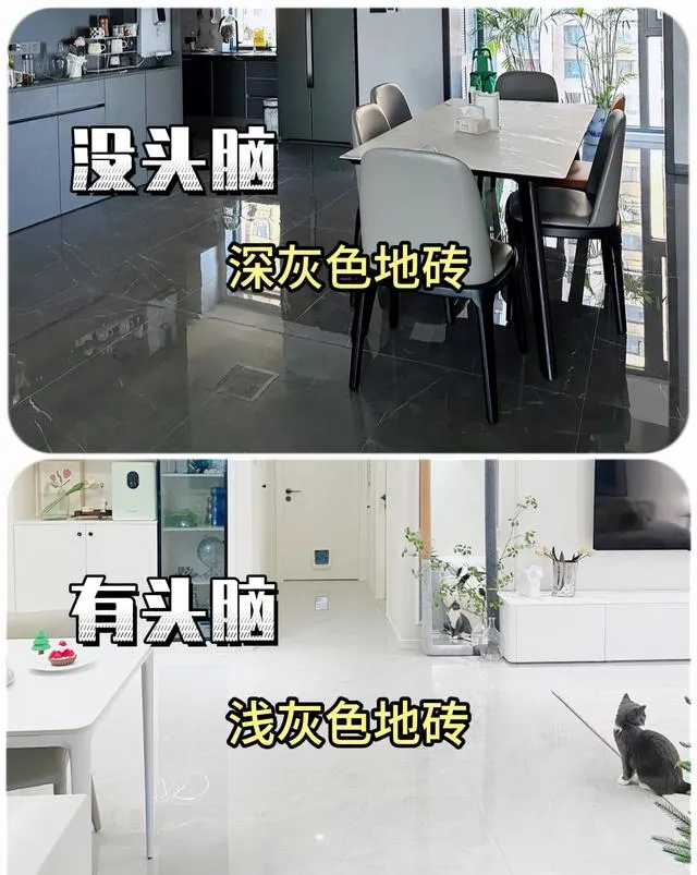 1、地磚不要選深灰色,要選淺灰色,深色會吸收較多光線,空間顯得壓抑和狹小,搭配上相對較難。
