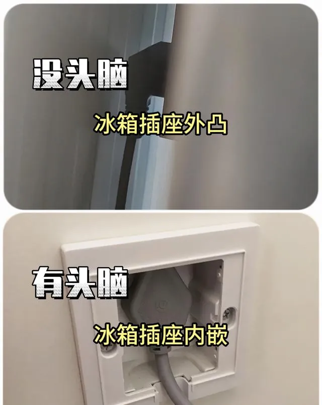 10、冰箱後面的插座用內嵌式,可以提高空間的美觀度、節省空間、保證安全可靠。