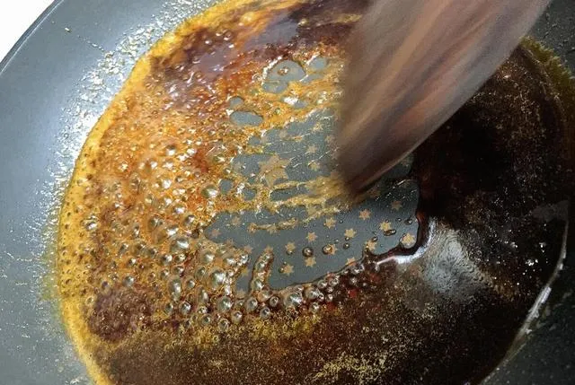 第三步, 鍋中倒入適量的食用油,放入冰糖,開小火將其炒出糖色,再將雞肉倒入到鍋中,翻炒均勻,使雞肉包裹上糖色。