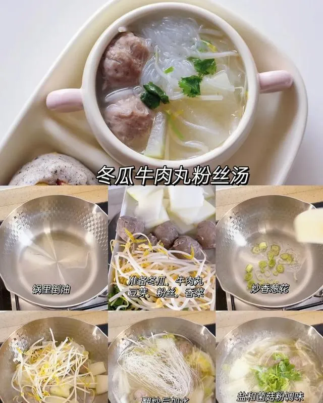 食材:冬瓜,牛肉丸,粉絲,香菜,豆芽