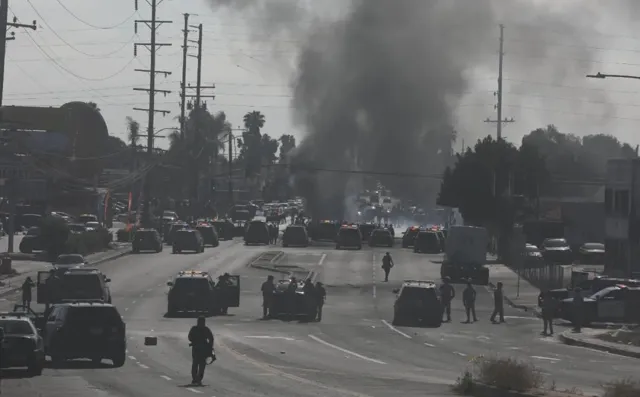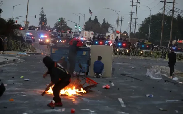 6月7日,在美國加州洛杉磯縣,示威民眾與警方對峙現場冒出濃煙。新華社發(邱晨攝)