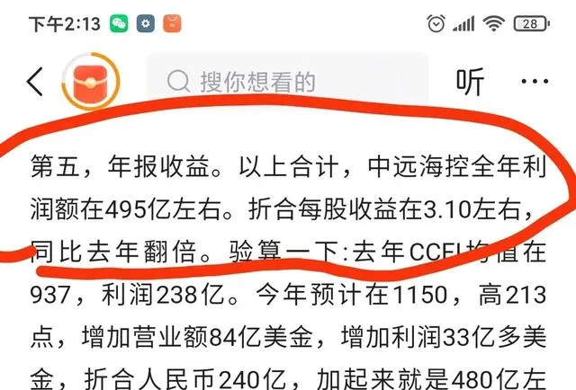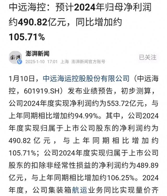 昨天,中遠海控釋出了2024年業績預告:公司2024年度實作歸屬於凈利潤約為490.82億元,與上年同期相比增加約105.71%。