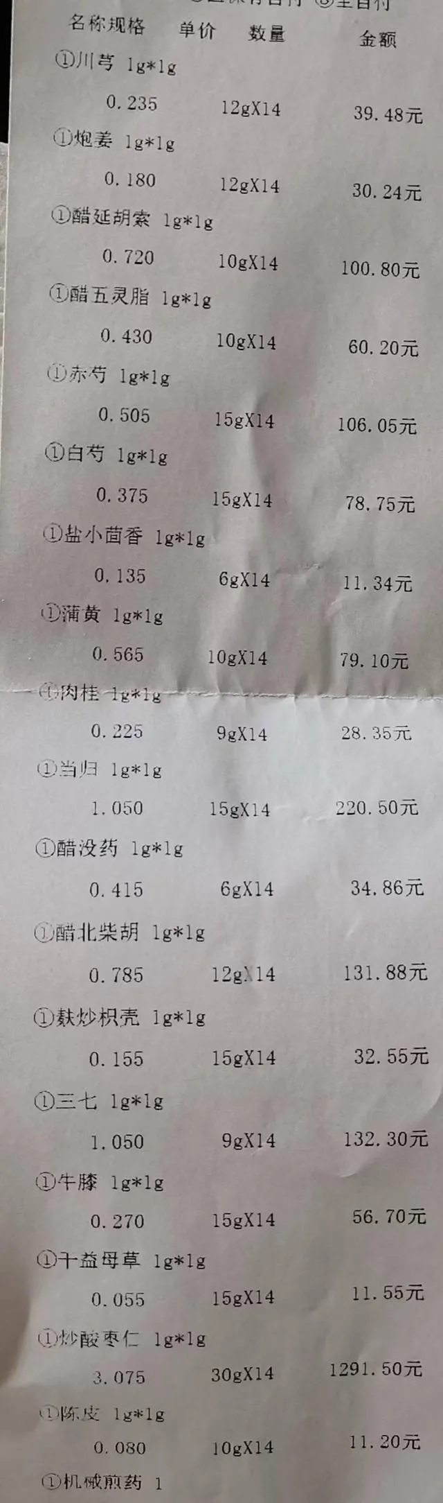 伊女士告訴記者,藥方共含白芍、川芎、肉桂、當歸等19味藥材。其中,炒酸棗仁用量達420克,僅此一味藥費用便達1291.5元,占總藥價的58.7%。